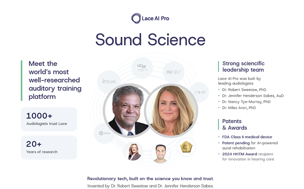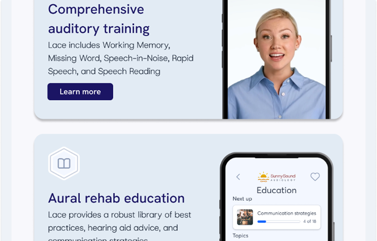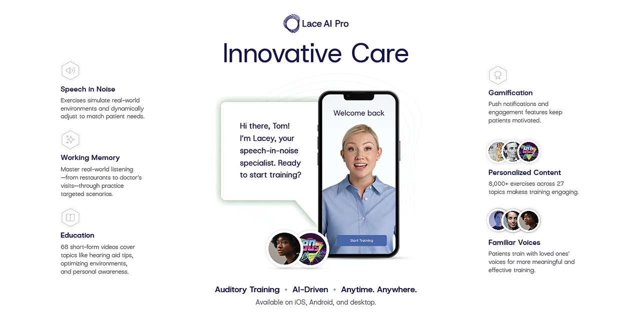 Lace AI Pro is a pioneering auditory training platform that helps people retrain their brains to hear better. Designed for older adults and anyone with hearing loss, its clinically validated software makes auditory training engaging and effective. Popular lessons like Speech in Noise and Working Memory are complemented by unique features such as My Voices, which lets users practice with the voices of family and friends—powered by AI.
