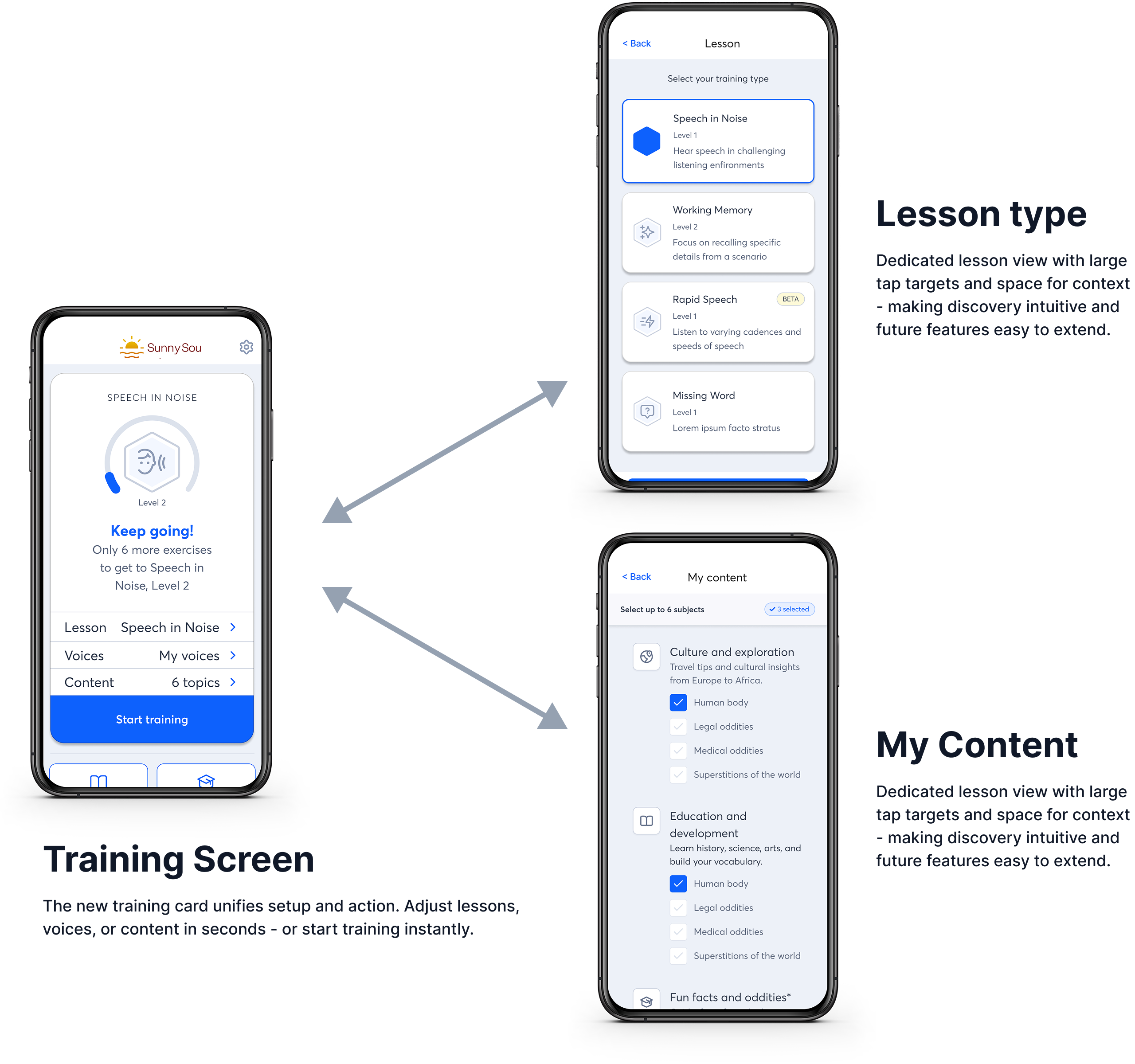 The Lace AI Pro training flow redesign streamlined the training workflow while increasing the discoverability of lesson types and valuable personalization features like My Voices and My Content. The new flow increased discoverability, clarity, and speed—making it easier for users to find, understand, and act. As important, the interaction pattern is both flexible and scalable, easily adjusting to different lesson and feature configurations, and currently being applied to a sister product, Tinnitus Pro.